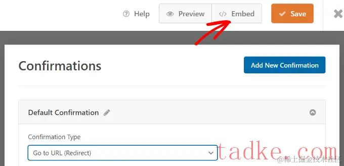 接下来,您可以转到设置»确认在表单生成器中设置。在这里,当用户提交表单时,您将有不同的选项可供选择。例如,您可以显示消息、页面或将用户重定向到另一个URL。