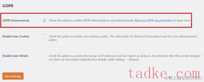 启用GDPR增强选项将显示另外两个与GDPR相关的设置。