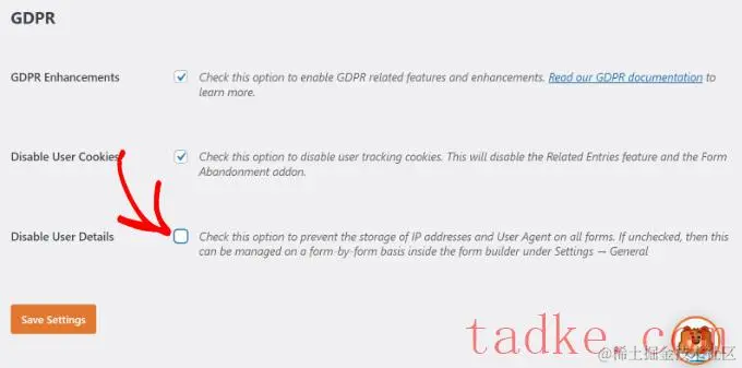 第二个选项是“禁用用户详细信息”,它将阻止WPForms存储用户IP地址和浏览器信息。这两个设置都是可选的,如果您觉得不需要这些功能,可以选中它们。