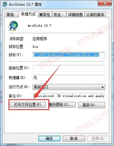 12.找到ArcGIS 10.7安装目录,在第5步中,如果你已经忘记了安装目录也没关系,我们找到【开始——所有程序——ArcGIS——ArcGlobe 10.7——鼠标右击——选择属性】。