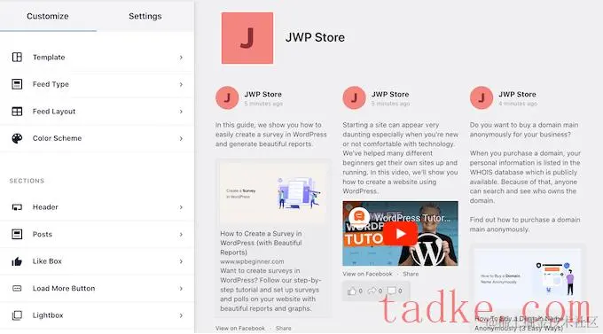 在这里,你可以改变提要的配色方案,以完美地匹配你的WordPress主题,设计一个定制的标题,添加“喜欢”和“加载更多”按钮,等等。