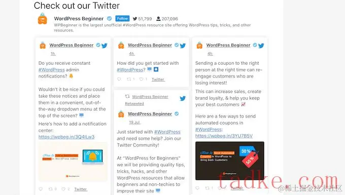 这个插件允许你创建一个提要,当你发布新的推文时,它会自动更新。然后,您可以将此提要添加到任何页面、帖子或小部件就绪区域。