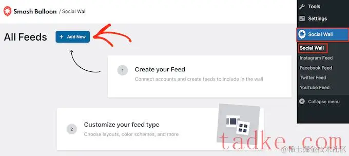 插件安装并激活后,请转到社交订阅源?创建社交墙。