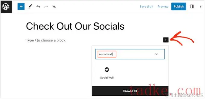 例如,要将社交墙添加到页面,只需在WordPress块编辑器中打开该页面。在这里,点击‘+’图标并输入‘Social Wall’。