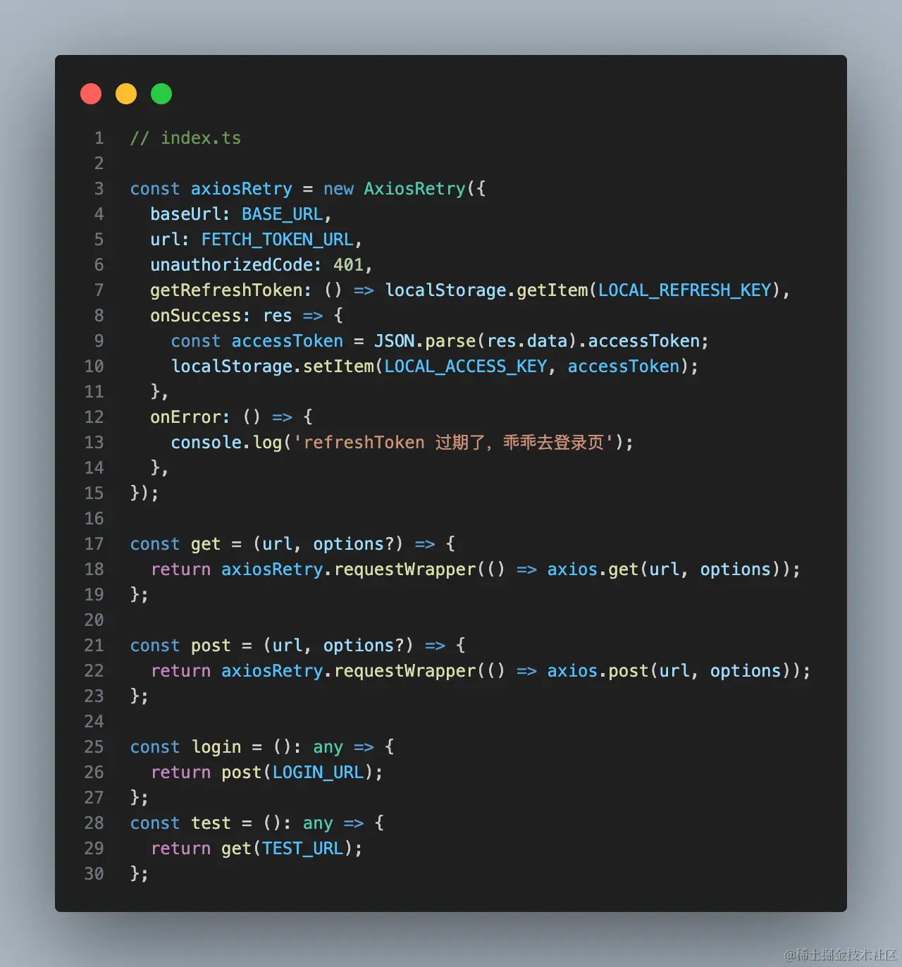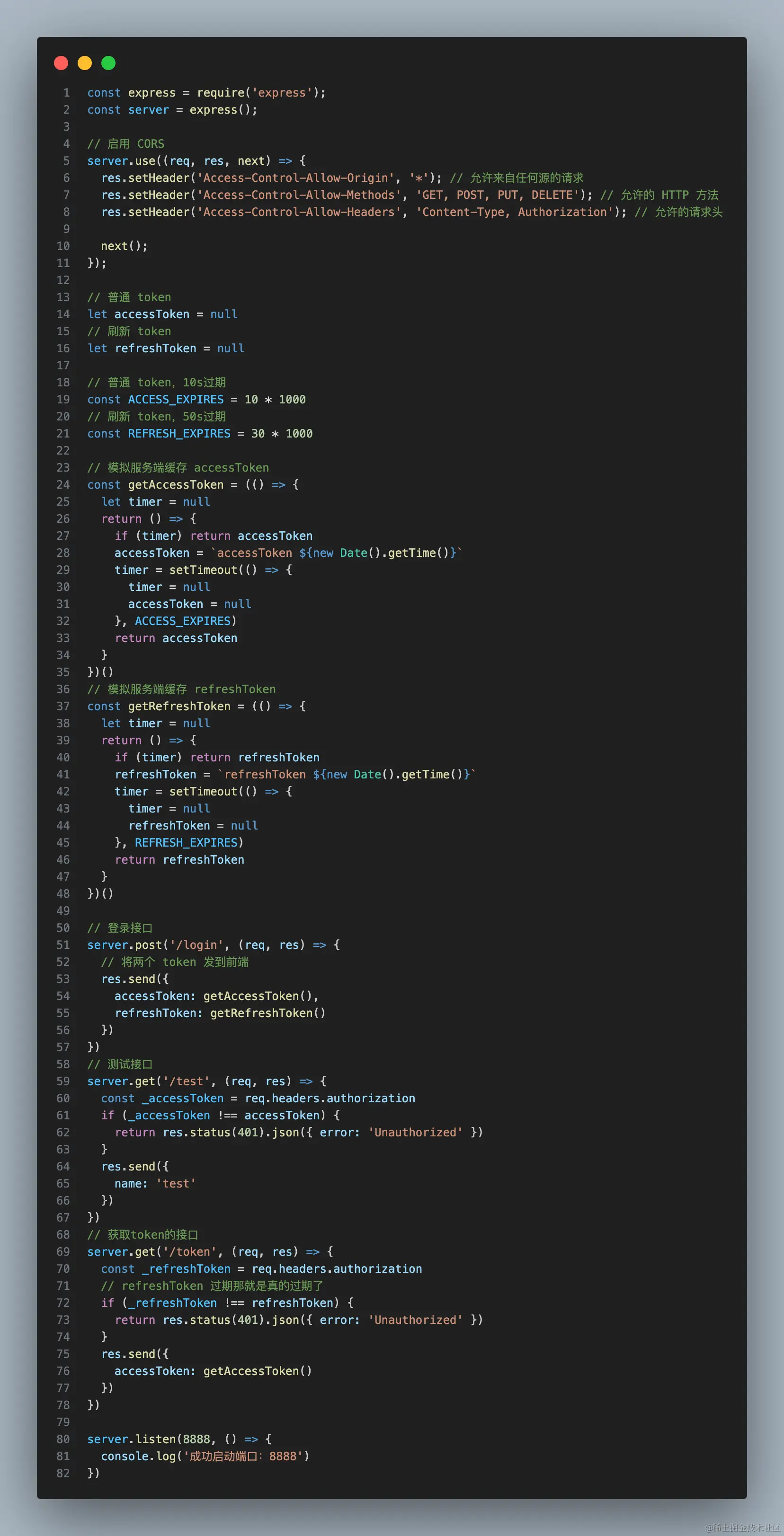 为了方便给大家演示,我用 express 模拟了后端的 token 缓存与获取,代码如下图(文末有完整代码)由于这里只是演示作用,所以我设置了