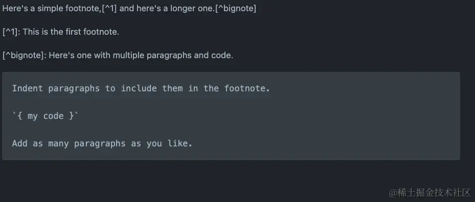 在括号内使用另一个插入符号和数字添加脚注,并用冒号和文本([^1]: My footnote.)。您不必在文档末尾添加脚注。您可以将它们放在除列表,块引号和表之类的其他元素之外的任何位置。