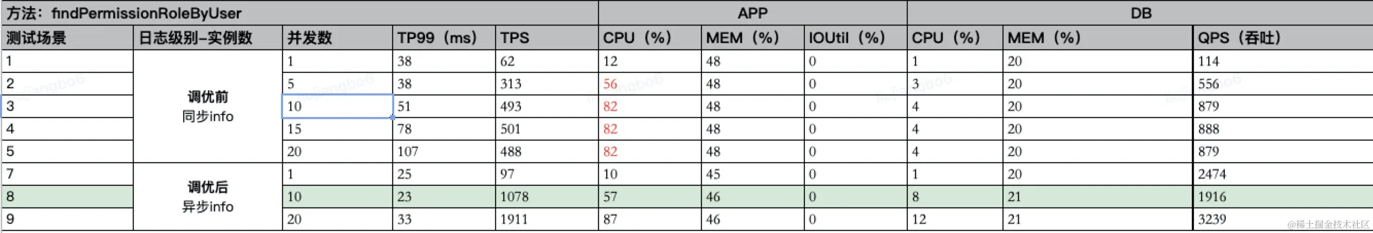 同步日志改成异步日志后。同样10并发,接口的TP99由 51ms 降到 23ms,接口的吞吐TPS由 493提高到 1078,应用的CPU由 82%降到 57%。