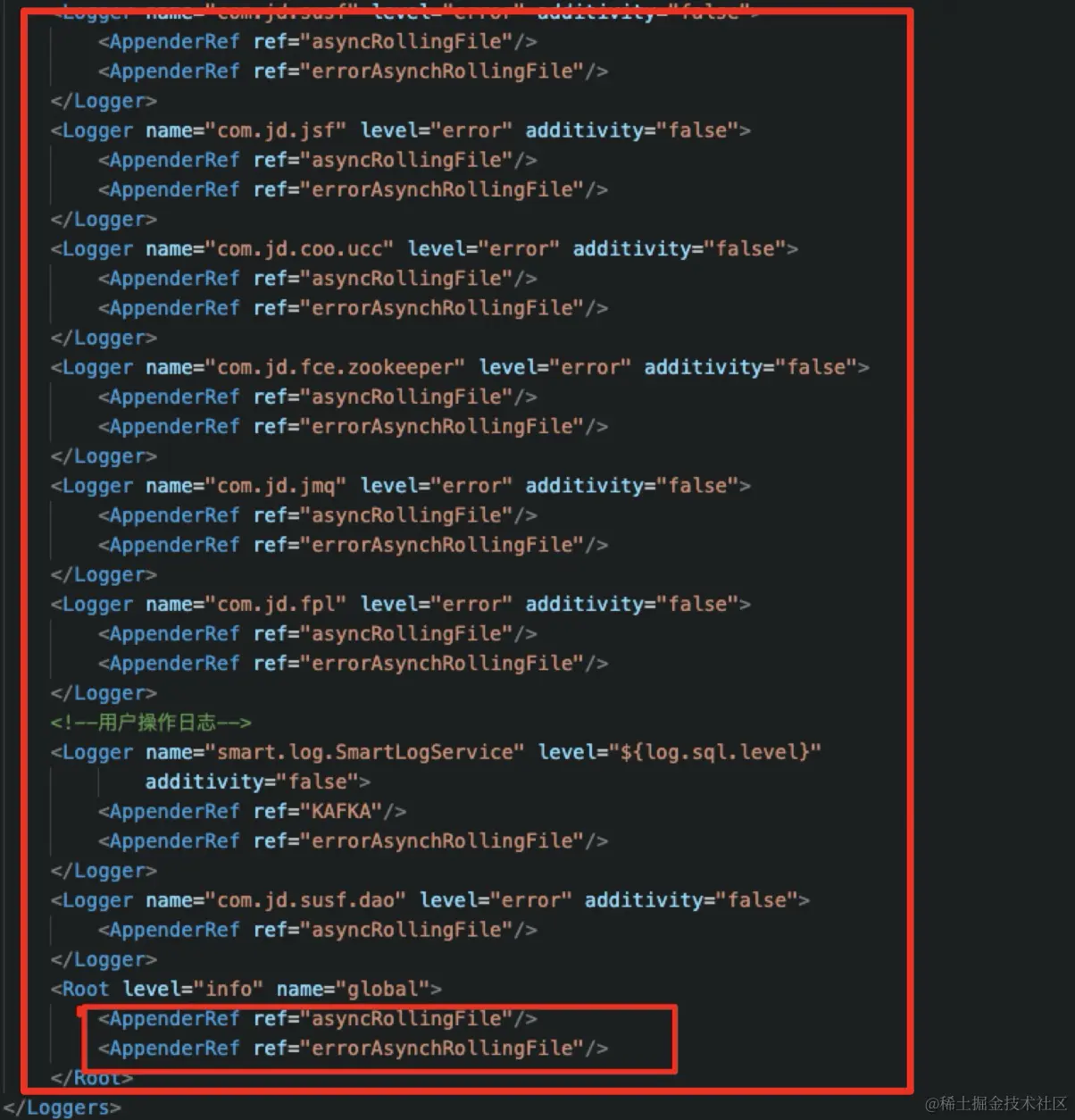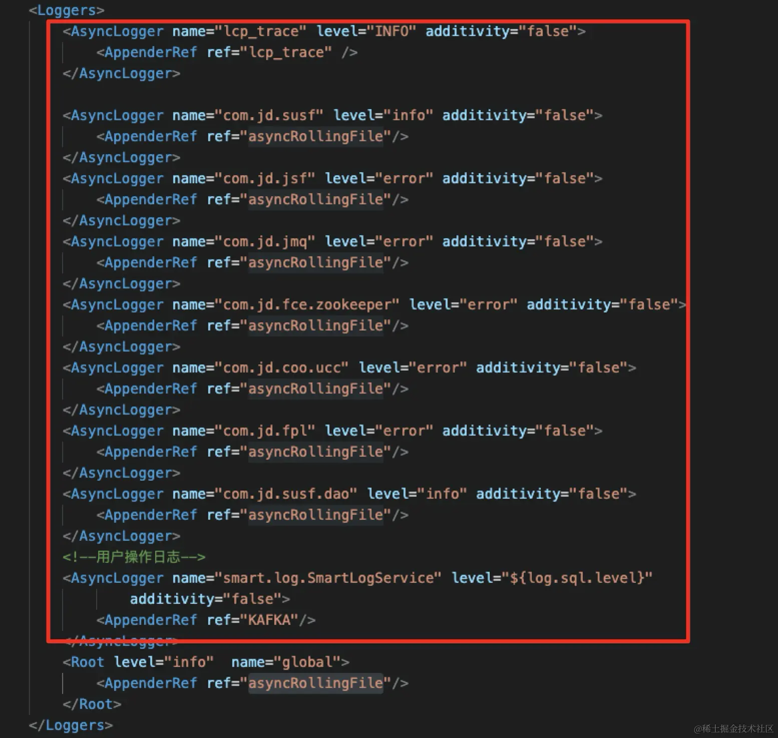- 不要同时使用AsyncAppender和AsyncLogger,也就是在配置中不要在配置Appender的时候,使用Async标识的同时,又配置AsyncLogger,这不会报错,但是对于性能提升没有任何好处。