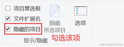 2.在显示/隐藏选项中,选中【隐藏的项目】方框;
