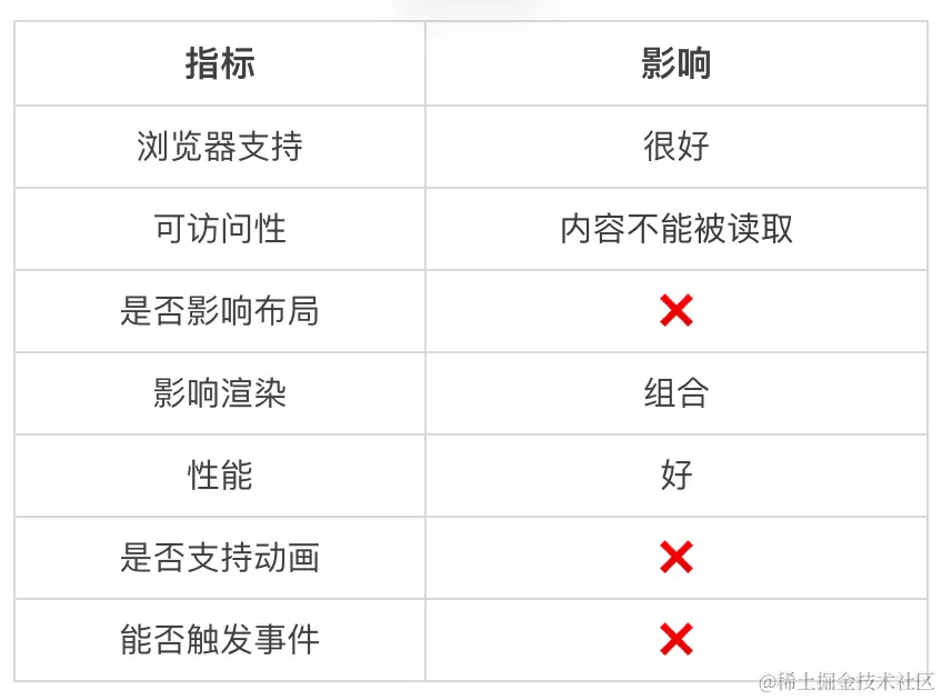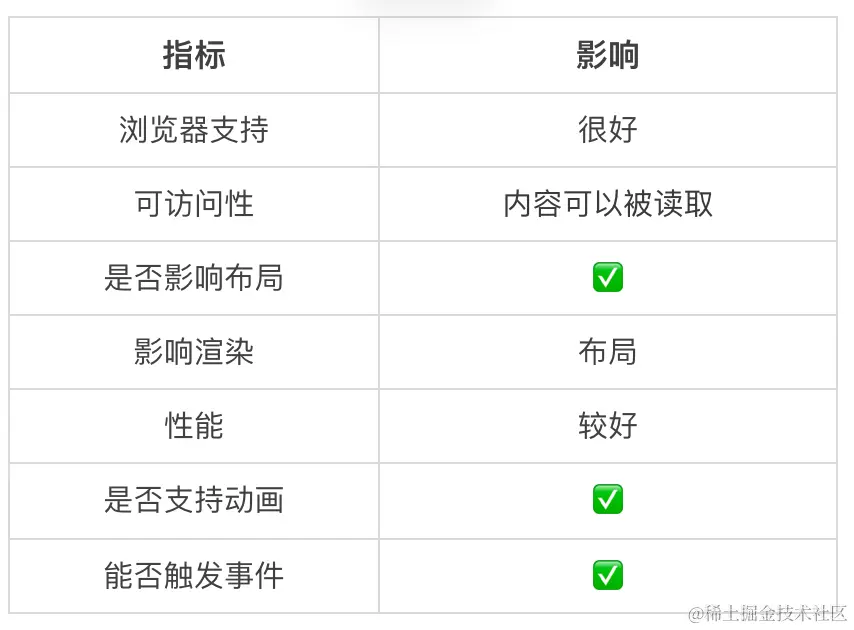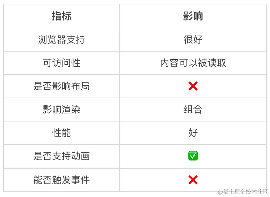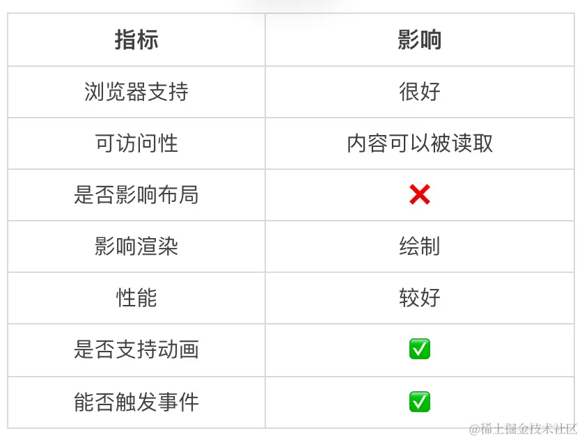 - 动画: 一些CSS隐藏元素的方法一般是全有或者全无,元素要么是完全可见,要么是完全不可见,并且没有中间状态。其他的,比如透明度,可以是一个范围的值,所以在这中间过程插入动画成为可能;