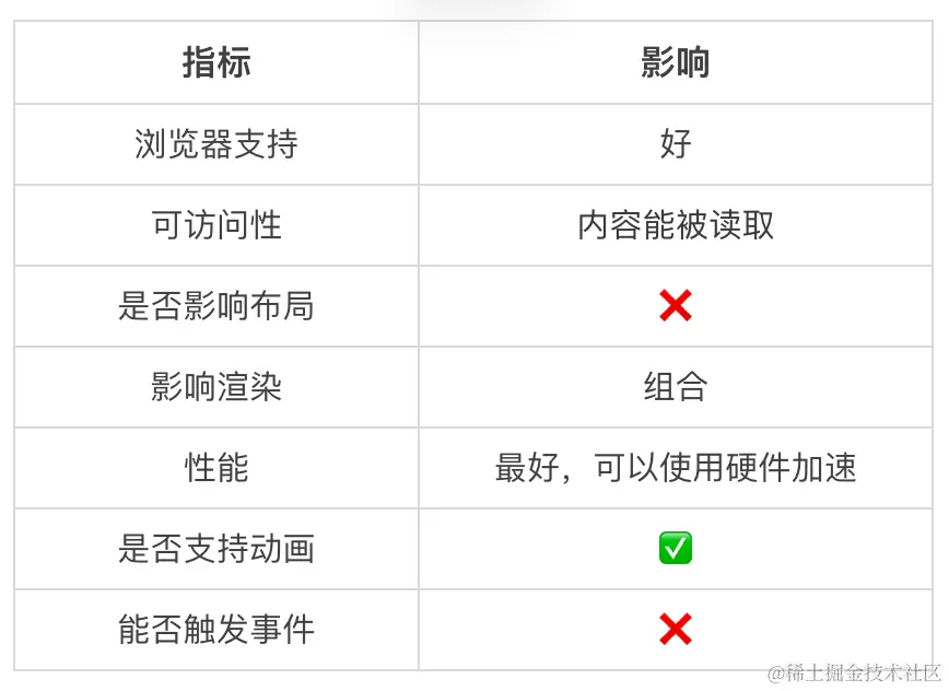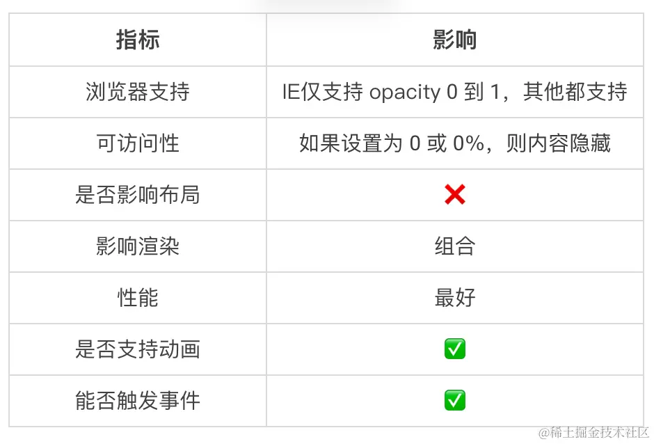 注意:opacity 可以设置动画并提供出色的性能,但页面上保留完全透明的元素可能会触发事件。