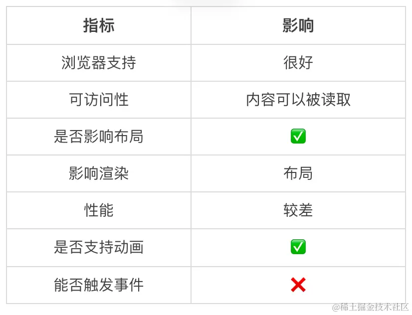 然而,在大多数情况下,display 可能是最糟糕的 CSS 属性。除非使用 position:absolute 将元素移出文档流,或者采用contain属性,否则它的隐藏过程无法设置动画,并将触发页面重新布局。