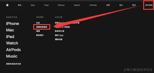 步骤3:打开苹果官网,点击导航栏中的【技术支持】,然后单击【查看保修服务】。