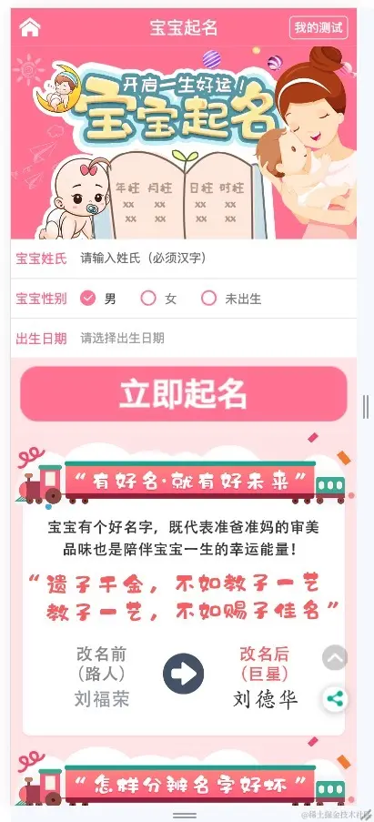 前一段时间和朋友一起聊副业赚钱的时候,他说到个轻资产可以赚钱的小项目,那就是帮宝宝起名,他给我看了下后台数据,说变现能力很强(具体数据就不透露了);于是乎,我就拍下脑袋吭哧吭哧的撸起袖子就开干。开干之前,我分析了一下市面上的起名小程序,发现大部分都长得差不多(应该是来自同一套模版);页面花里胡哨,套路也都是先吸引你付钱,付完钱后再给你丢几十套名字(哈哈,我花30块买的小程序也是如此)。
