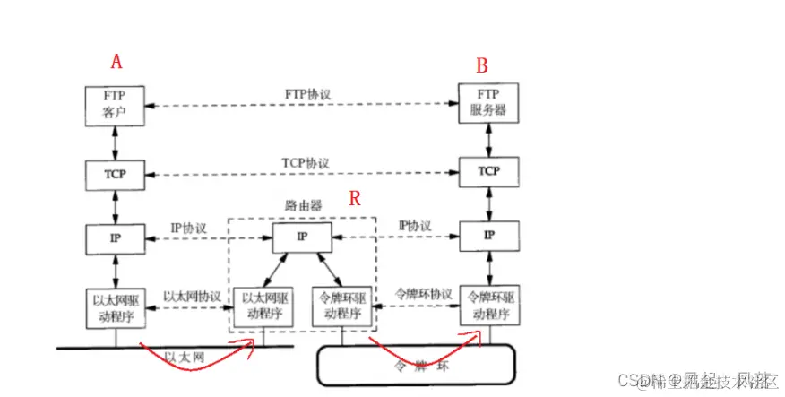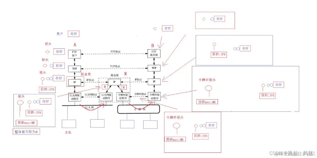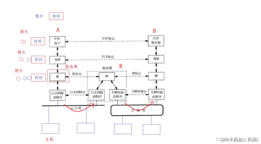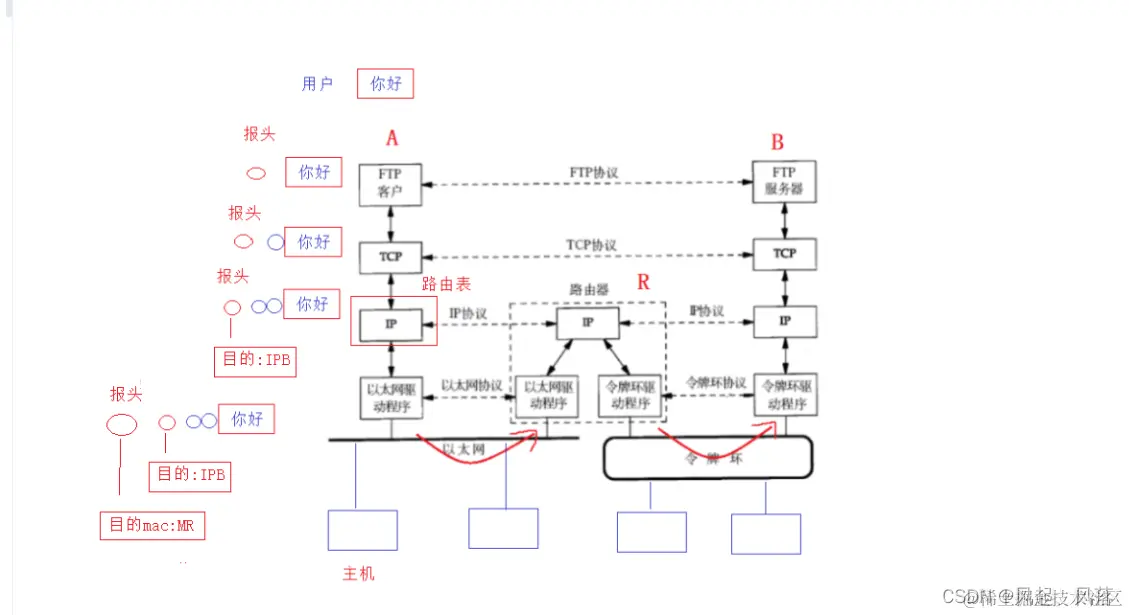 以太网和令牌环中存在更多的主机 当要发送消息时,并不是将消息直接发送给对方,先添加自己应用层的报头,然后将报头与有效载荷交付给下一层