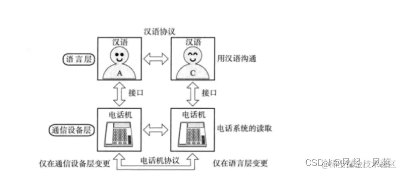 所以分为语言层和通信设备层,在逻辑上认为都在和对方层进行通信 层和层之间通过接口的方式来进行互相调用底层的功能 但底层如何实现的,上层并不关心 如:你打电话时,并不关心电话采用的频率是多少