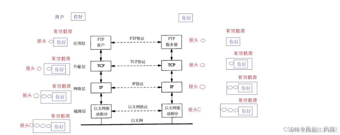 每一层协议都要有各自的协议报头,加上有效载荷 如:收到一个包裹,包裹上面的纸称为报头,包裹里的东西称之为有效载荷