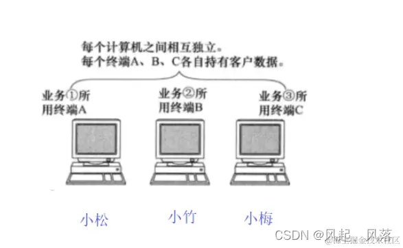 各个计算机之间是独立的 将小松计算后的数据拷贝到软盘中 交给小竹 将小竹计算后的数据拷贝到软盘中 交给小梅 但是人参与的工作,效率会非常低