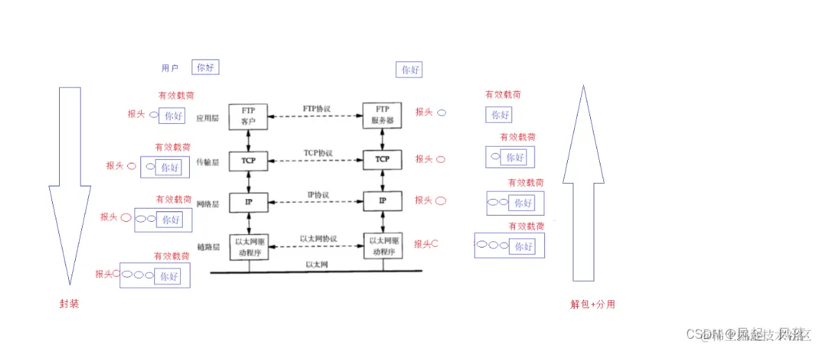 将报头从上到下贯穿,称为封装 将报头自底向上进行交付,称之为解包加分用 解包:将报头和有效载荷分离 分用:将有效载荷交付给上层