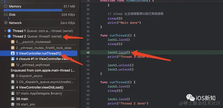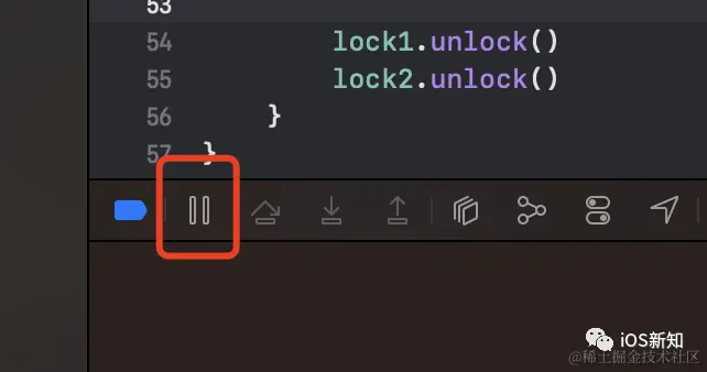 当发现程序没有按照预期执行时,即 runThread1 和 runThread2 两个方法中的 print 都没有执行,可以手动点击 Xcode 底部工具栏中暂停应用程序按钮: