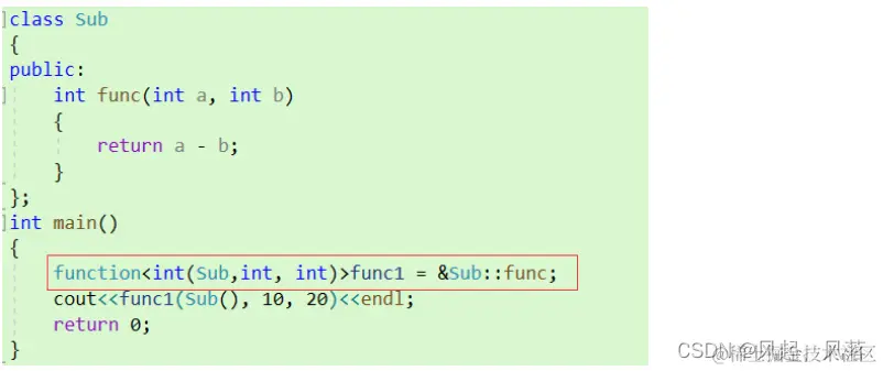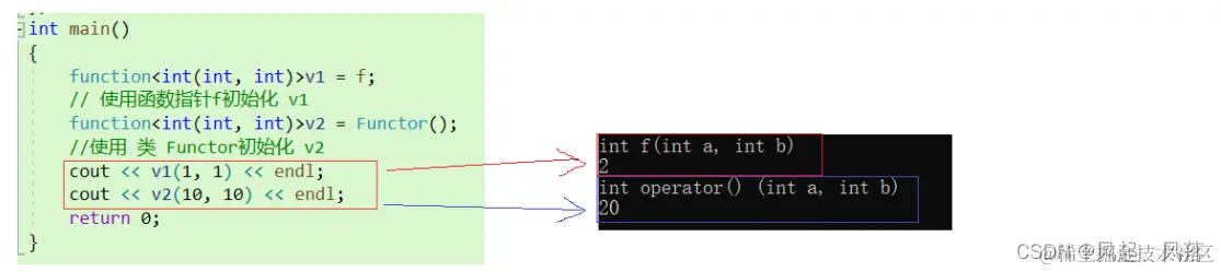 function<int(int,int)> 第一个int作为返回值 小括号中的两个int参数,作为被调用函数的参数 此时既可以使用函数指针进行初始化,也可以使用仿函数进行初始化