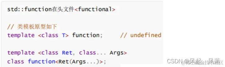 模板参数 Ret : 被调用函数的返回类型 ...Args作为参数包,这个参数包中包含0到任意个模板参数 Args... :被调用函数的形参