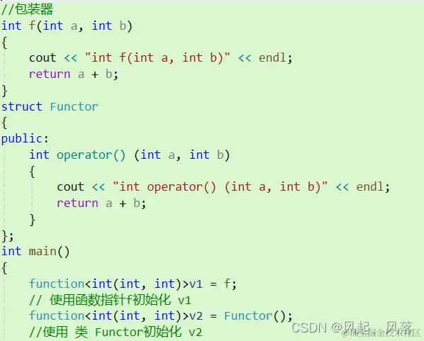 对于产生的包装器对象v1和v2,两者的类型是相同 但在调用时,一个调用的是f函数,一个调用的是Functor中的operator()