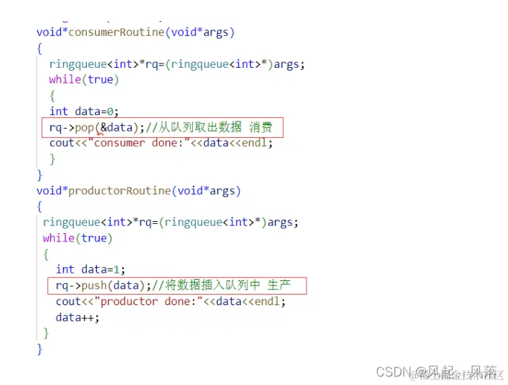 productorRoutine的回调函数中 使用 队列rq的push,将数据插入到队列中 即生产 consumerRoutine的回调函数中 使用 队列rq的pop,把队列中的数据取出 即消费