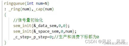 0表示线程间共享,将数据信号量 初始化为0,将空间信号量初始化为整个环形队列的容量 (对于两者的初始化值大小,在原理处都有详细解释)