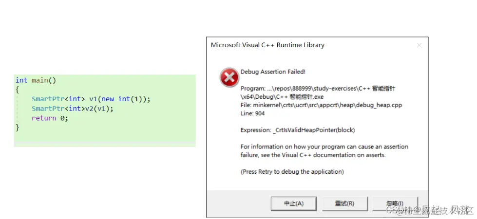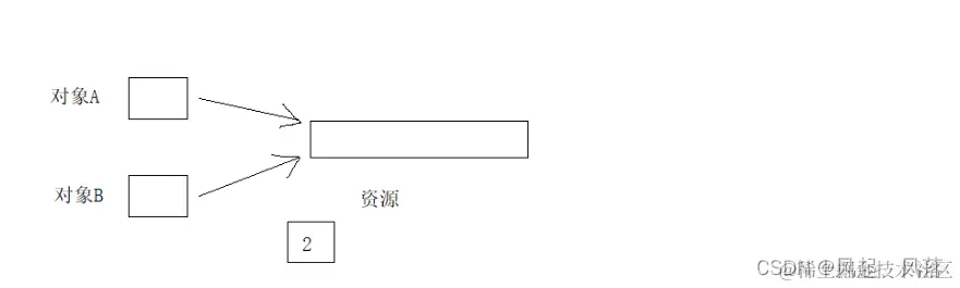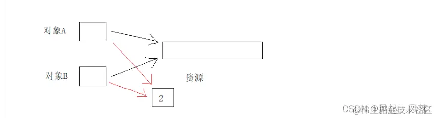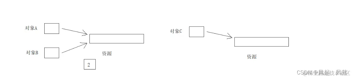 有两个对象指向资源,当析构时,会析构两次 为了解决这个问题,就增加一个引用计数,若只有一个对象,就为1,若为两个对象,则为2