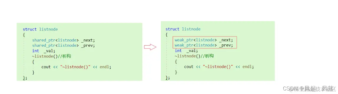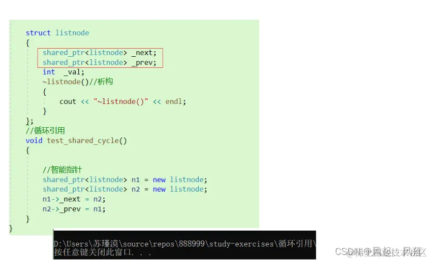 将_next和_prev改为 weak_ptr即可解决问题 使用weak_ptr可以指向资源,但不参与管理,不增加引用计数