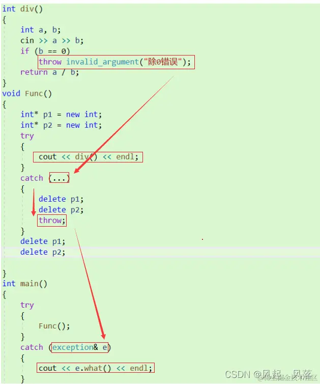 可以看出处理起来非常麻烦,存在内存泄漏的问题(只进行new,但没有delete) 第二个new抛异常要释放第一个new,div抛异常要释放前两个new 若再添加一个new,则又会存在new抛异常的问题,还需添加 try catch