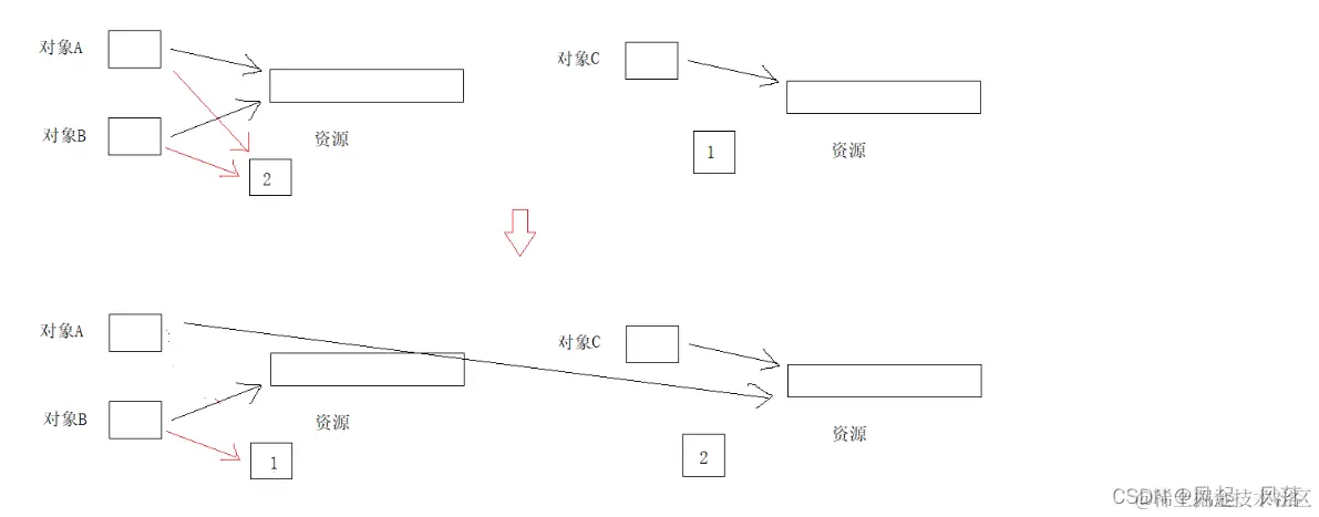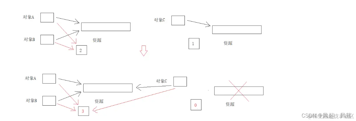 若将对象C赋值给对象A,则使对象A指向对象C的资源处 ,同时对象B的引用计数-1,对象C的引用计数+1