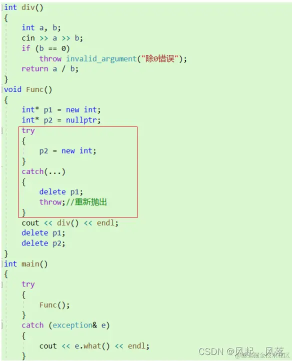 若div处抛异常,则将p1与p2都释放,再将其重新抛出