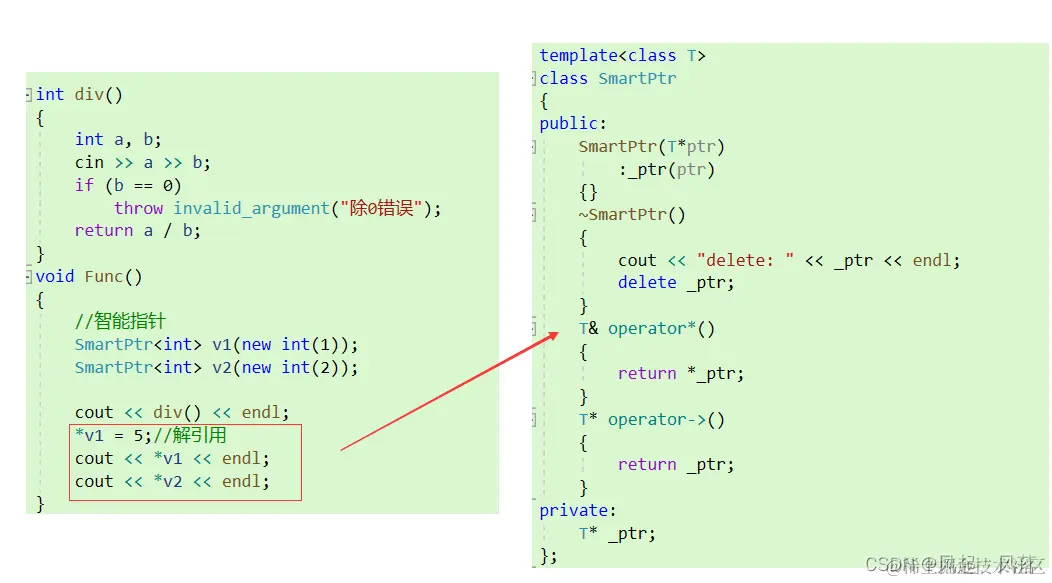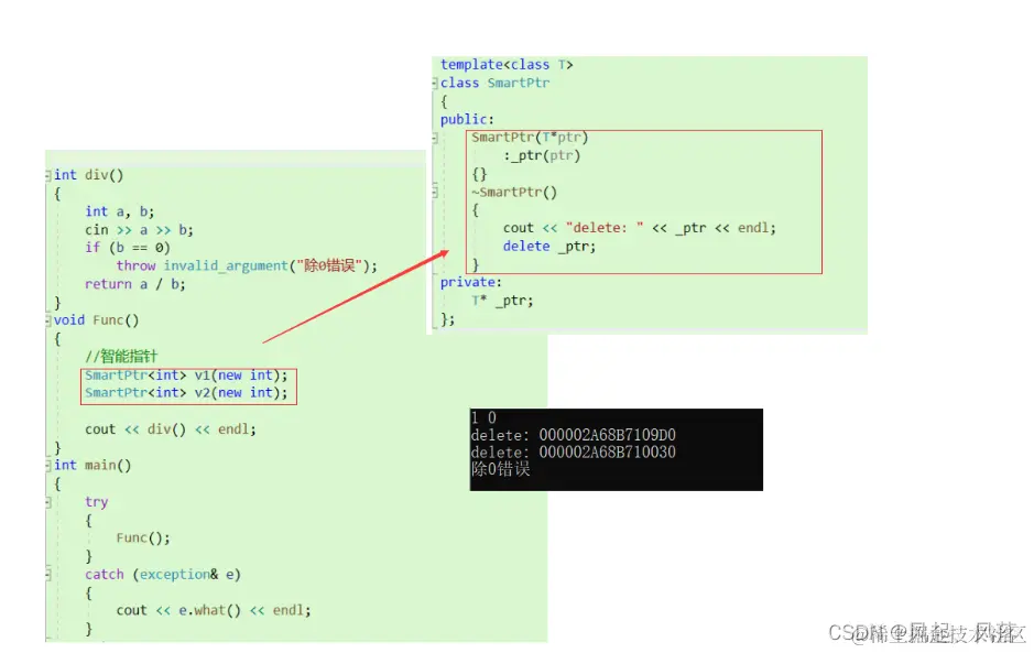 若第一个new抛异常,就不会进入构造函数中 若第二个new抛异常,则调用析构,将第一个new释放掉 若div抛异常,则v1和v2对象都调用析构,将第一个new和第二个new都释放掉