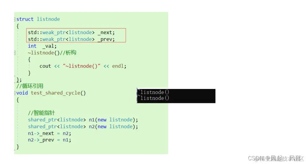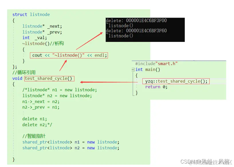 出了作用域,先将n2节点析构,使其引用计数减1,此时n2的引用计数为1,还有一个_next的智能指针指向n2,只有当_next析构n2才能析构,而_next是随着n1节点析构而析构 再将n1节点析构,使其引用计数减1,此时n1的引用计数为1,还有一个_prev的智能指针指向n1,只有当_prev析构n1才能析构,而_prev是随着n2节点析构而析构