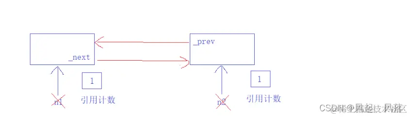 n1的引用计数为1,将n2的_prev指向n1,导致n1的引用计数加1
