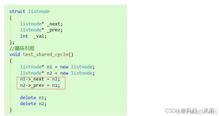 节点使用原生指针可以释放,而使用智能指针不能释放,这样的问题被称为循环引用
