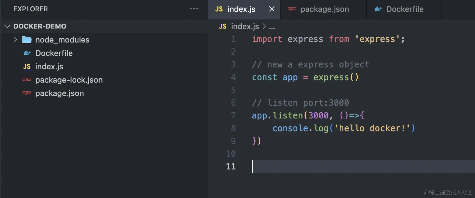 假如想要创建一个 nodejs 容器,可以本地创建一个项目,如图: