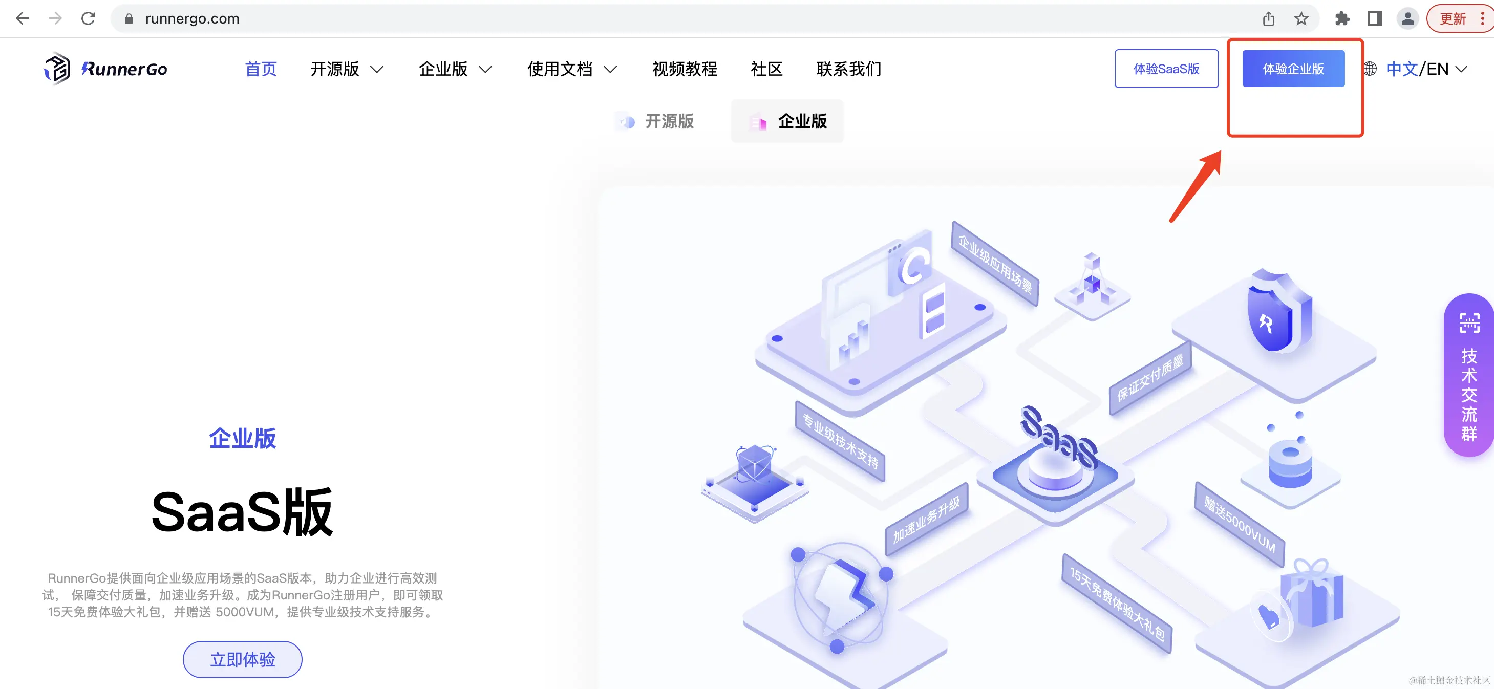 首先需要进入官网,RunnerGo支持开源,可以自行下载安装,也可以点击右上角体验企业版按钮快速体验