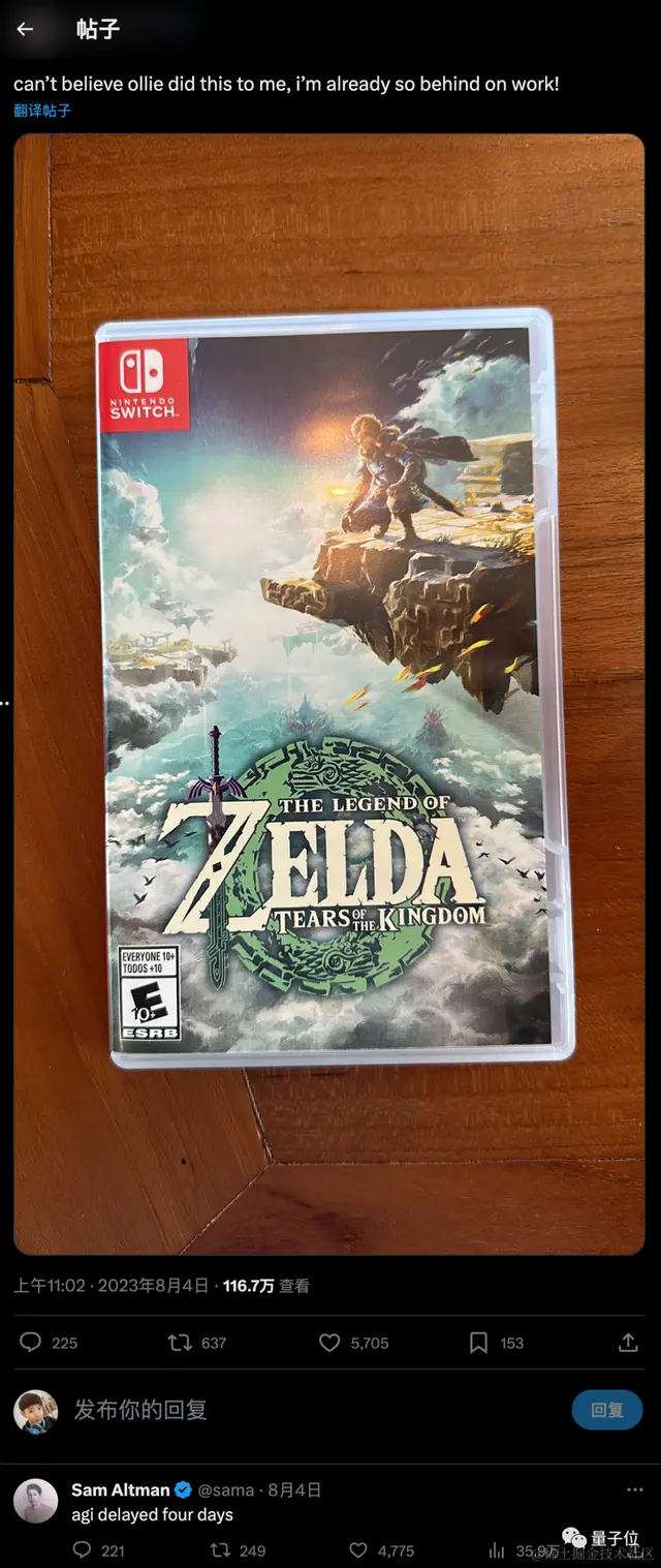 就连收到同事送的《塞尔达传说》游戏,在表示这款游戏害得他落下许多工作之后,也不忘提一句 AGI: