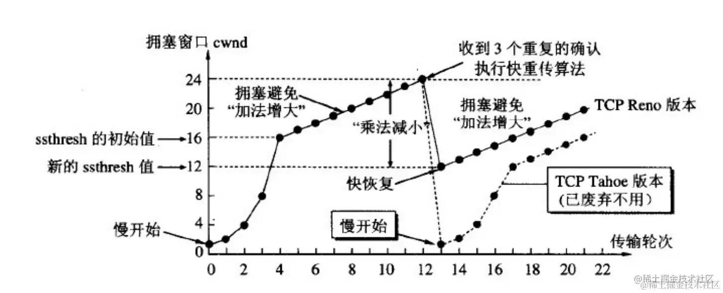 - 当发送方连续收到三个重复确认时,就执行“乘法减小”算法,把ssthresh门限减半。但是接下去并不执行慢开始算法。