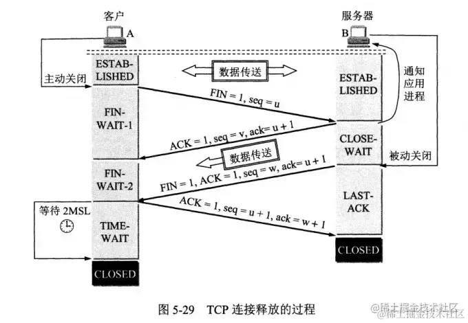 即客户端收到服务端的连接释放报文段后,对此发出确认报文段(ACK=1,seq=u+1,ack=w+1),客户端进入TIME_WAIT(时间等待)状态。此时TCP未释放掉,需要经过时间等待计时器设置的时间2MSL后,客户端才进入CLOSED状态。