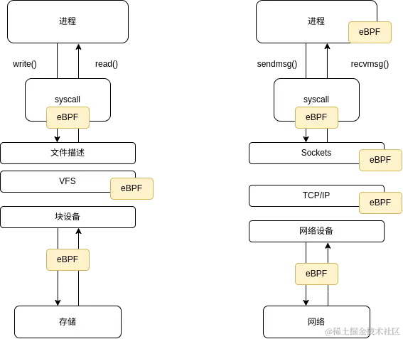 图1 eBPF在网络、存储中的使用范围及进程函数调用