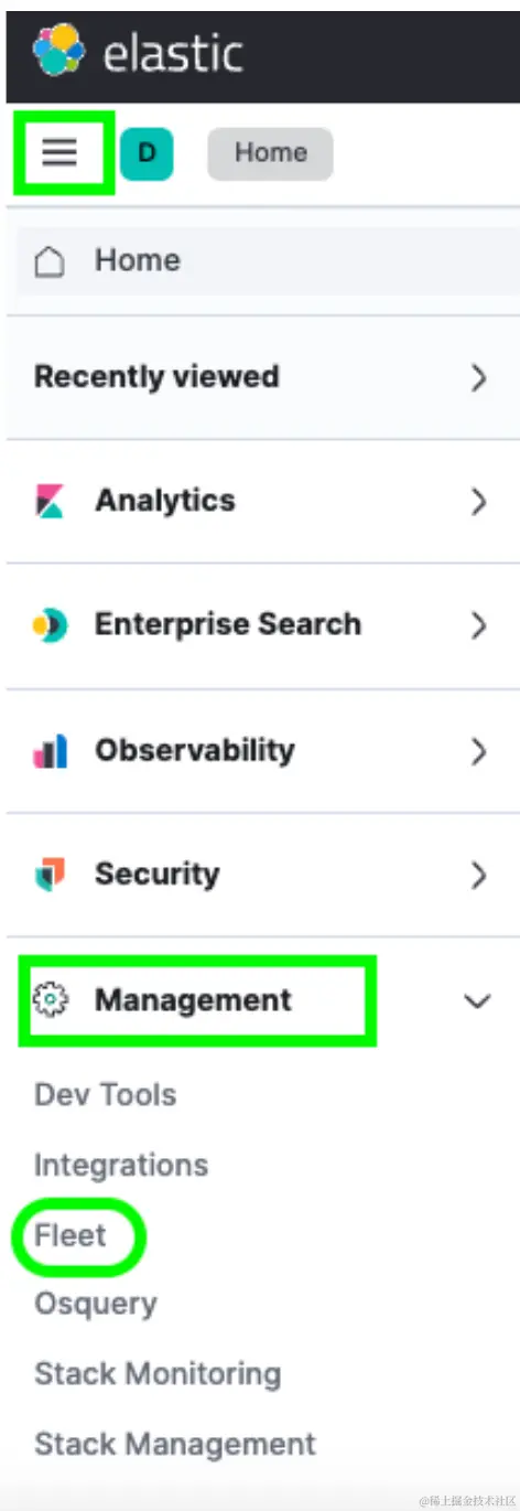 运行命令 docker compose up 将启动所有容器,并允许你通过 https://localhost:5601 登录 Kibana。 请记住,由于我们现在已经为 Kibana 准备了证书,因此我们必须使用 HTTPS,因此你可能必须单击浏览器向你提供的任何证书警告。登录后,你可以通过汉堡菜单 -> Management -> Fleet.。
