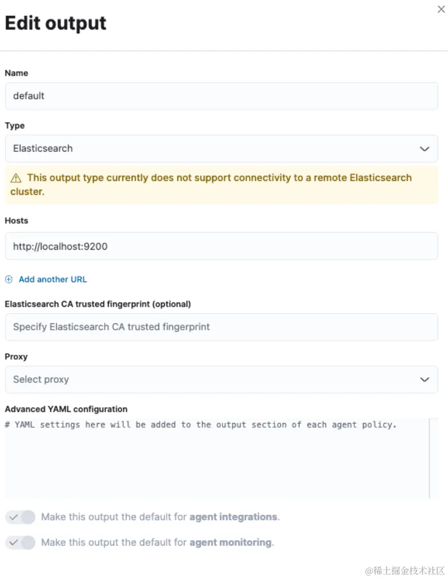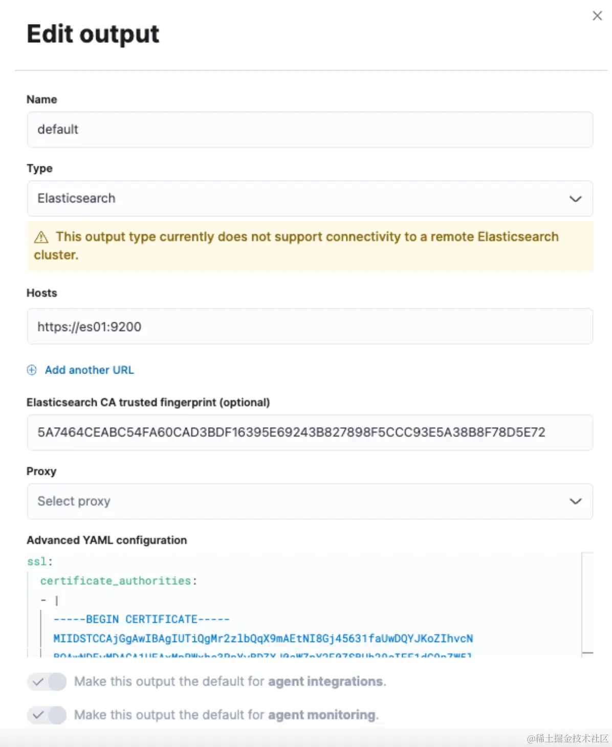我们需要更改 “Hosts” 字段以及 “Elasticsearch CA trusted fingerprint” 字段,以及对 “Advanced YAML configuration” 部分的更改。