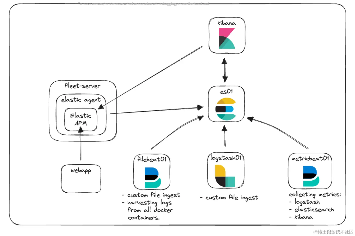 在这里你可以看到我们有新的 Fleet-Server 容器,它正在运行 Elastic Agent,充当所有代理与 Elastic 集群通信的中央通信点。 Elastic Agent 正在运行 Elastic APM 集成,以便从我们的自定义 Web 应用程序和 Kibana 收集遥测信息。