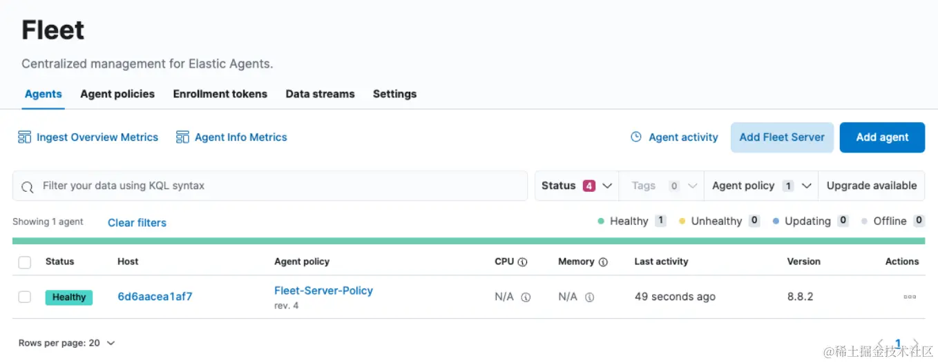 到达那里后,你将在 “Agents” 菜单下看到一个主机。 你可以在此 “Fleet” 页面中查看已注册到集群中的所有代理。 你还可以创建或更改策略、注册新代理以及更新任何全局队列配置。