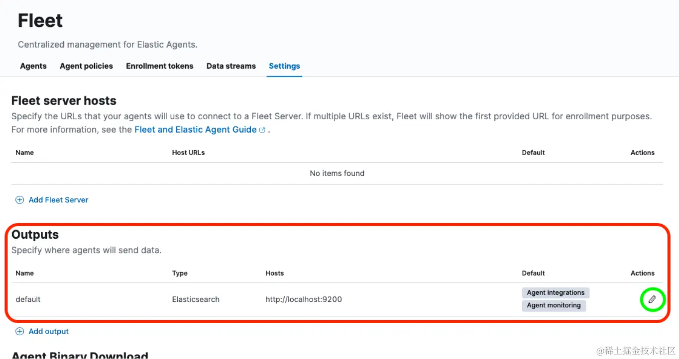 导航到 “fleet” -> “Settings”后,我们要查看 “Output”部分,然后单击 “Actions” 标题下的 “Edit” 按钮: