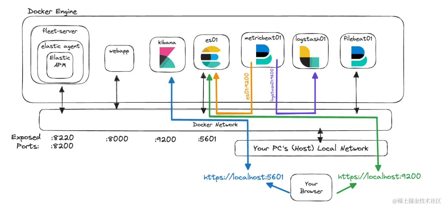 该网络位于 Docker 引擎内部,允许所有容器相互通信并解析其他容器的名称。 为了允许来自浏览器的流量到达容器,我们在每个服务中公开必要的端口。 例如: